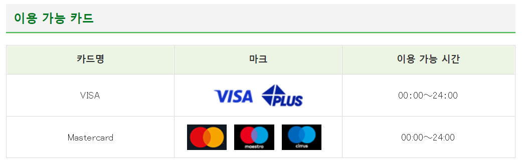 두 은행에서 안내하고 있는 내용입니다. 위 사진을 확인해 보면 두 ATM 모두 비자와 마스터카드 이용을 지원하고 있습니다. 그래서 저는 인터넷에서 떠돌던 정보와 반대로 사용해 보았습니다.
