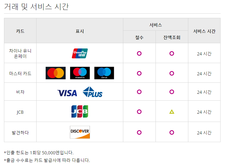 결론부터 말하면 어떤 카드든 상관없이 두 ATM에서 인출 수수료 없이 무료로 이용가능합니다. 다만, 기기 이용 수수료는 발생할 수 있으며 ATM마다 달라서 복불복입니다.