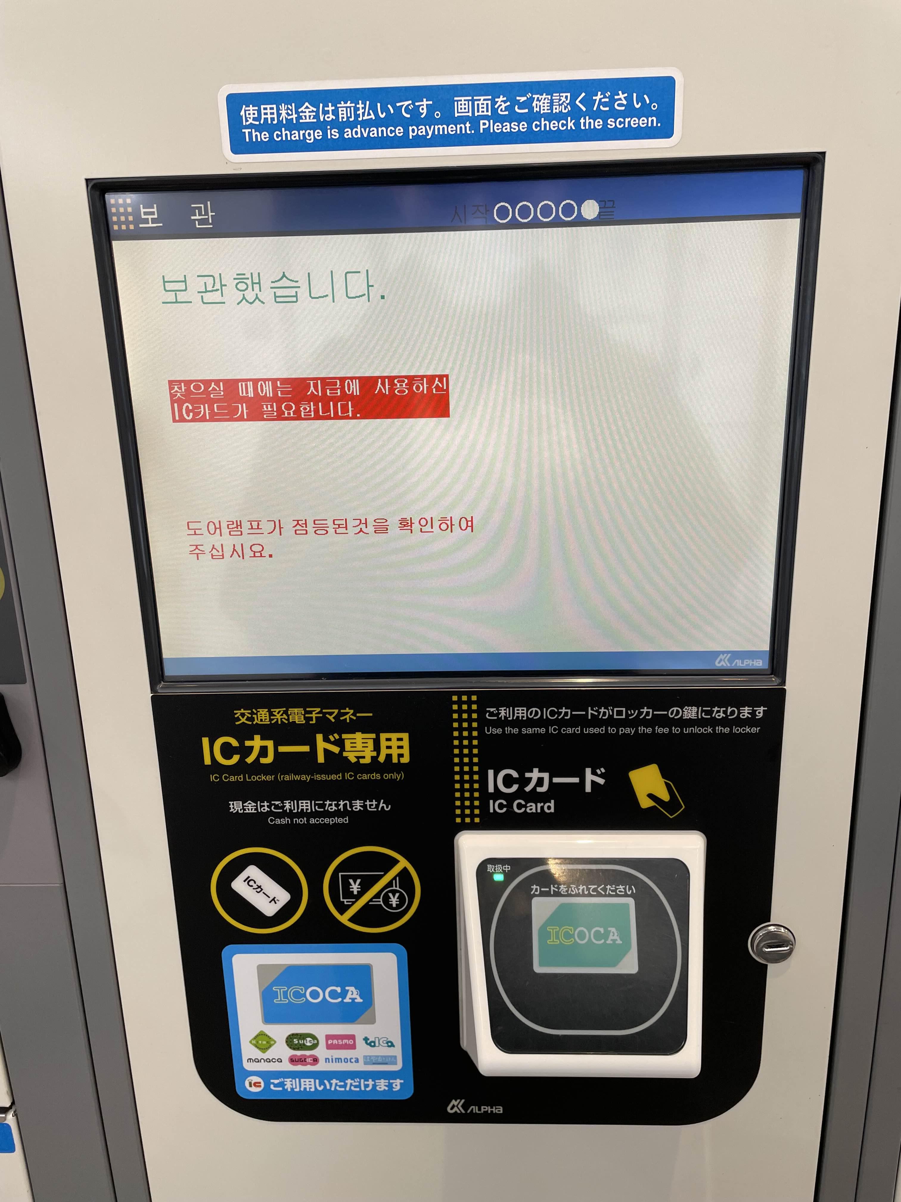 이렇게 하면 코인라커에 간단히 짐을 보관할 수 있습니다. 참 쉽죠? 짐을 찾을 때 결제한 IC카드 또는 이코카 카드 열쇠로 사용되니까 분실하시면 안 됩니다!!