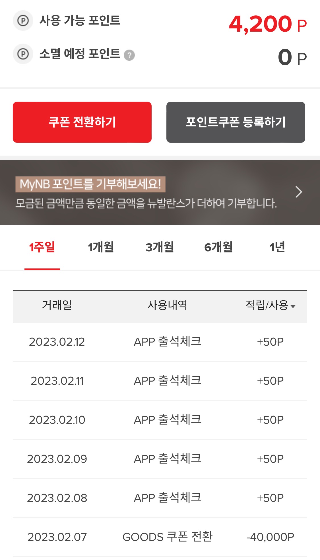 포인트는 어쩌다 보니 4만 포인트 이상 모았습니다. 하루에 앱에 접속만 해도 50포인트씩 적립되고, 14일 접속하면 +1,000포인트, 28일 접속하면 +2,000포인트 추가 적립됩니다. 한 달에 최대 4,500포인트 모을 수 있습니다.