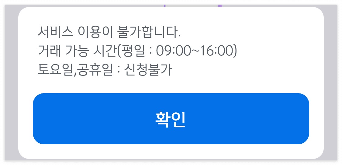 단, 평일 09:00~16:00, 사이에만 거래 가능하고, 주말 및 공휴일은 신청 불가합니다.