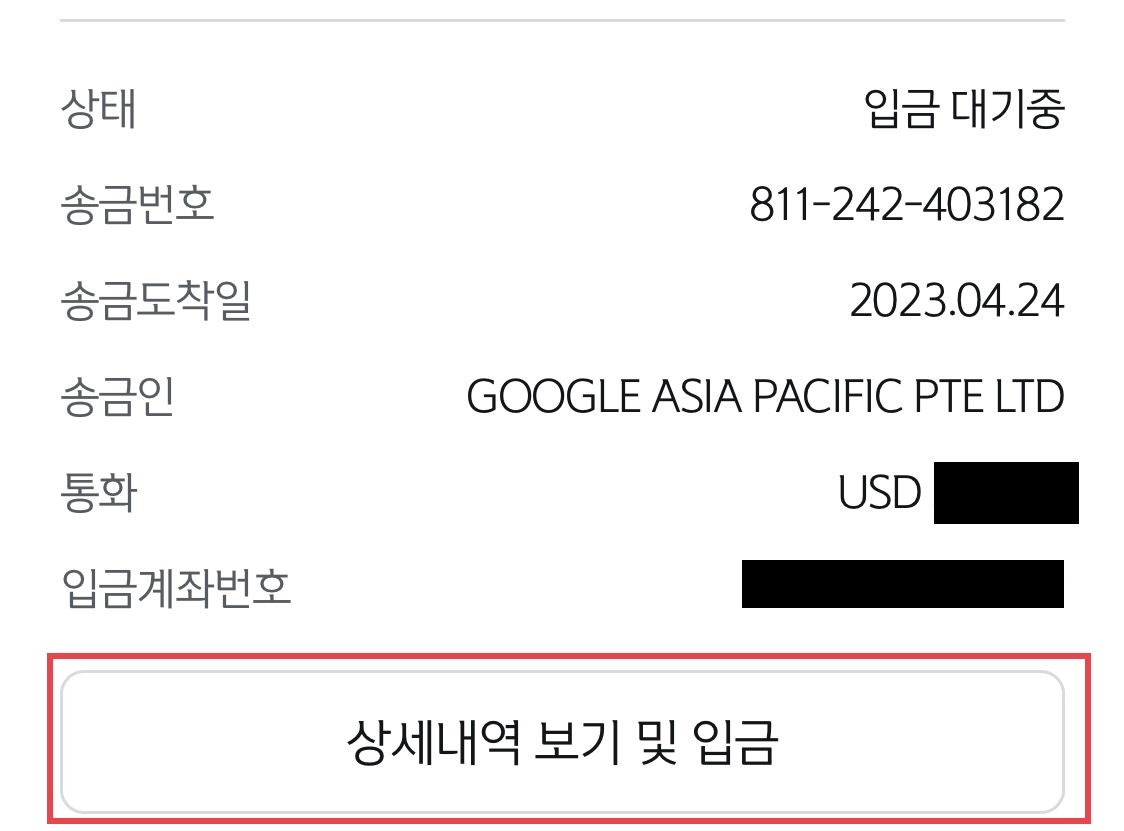 상세내역 보기 및 입금을 누르고, '입금받기'를 누르면 애드센스 수익 지급이 완료됩니다.