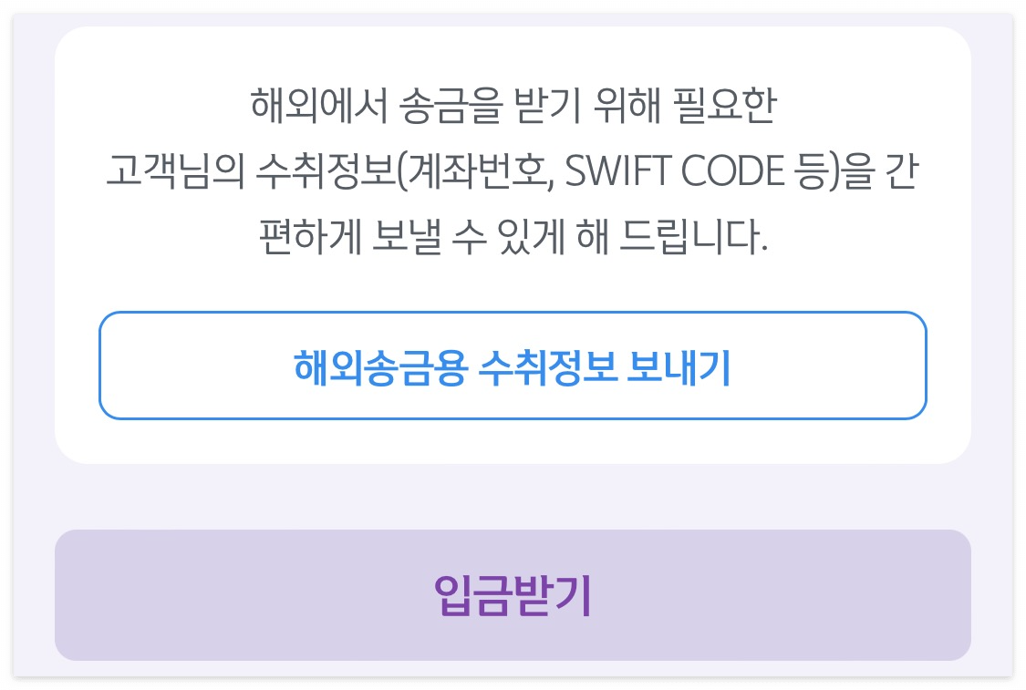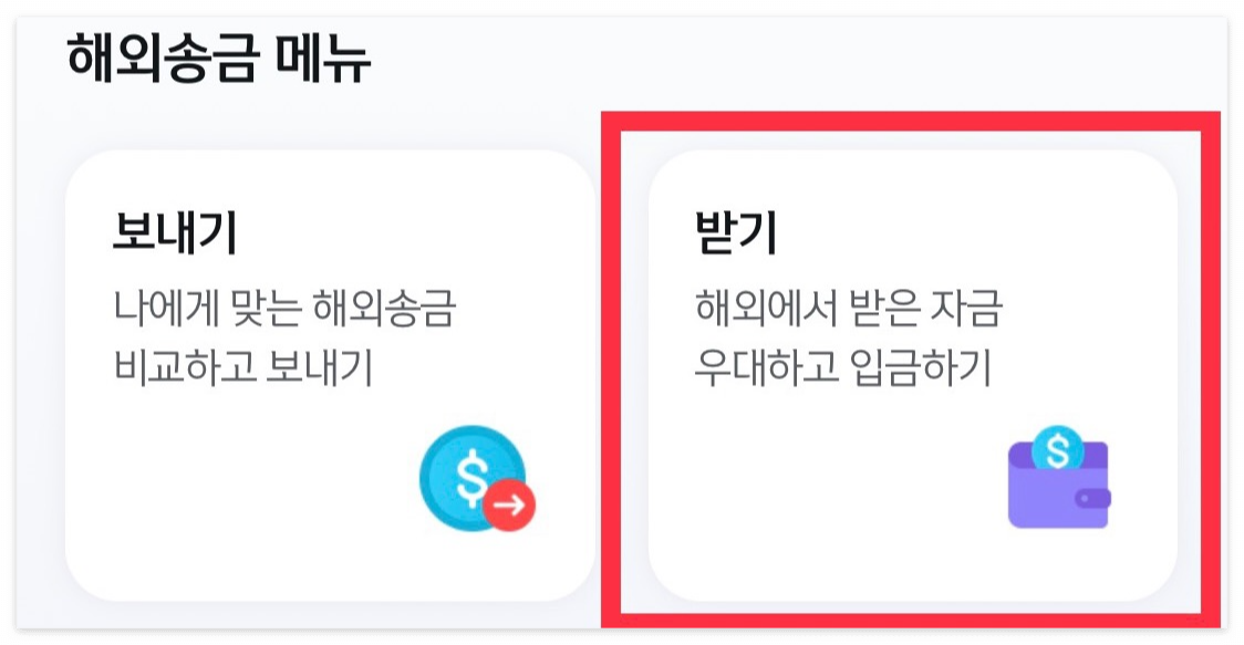 해외 송금 메뉴에서 '받기' 선택합니다.