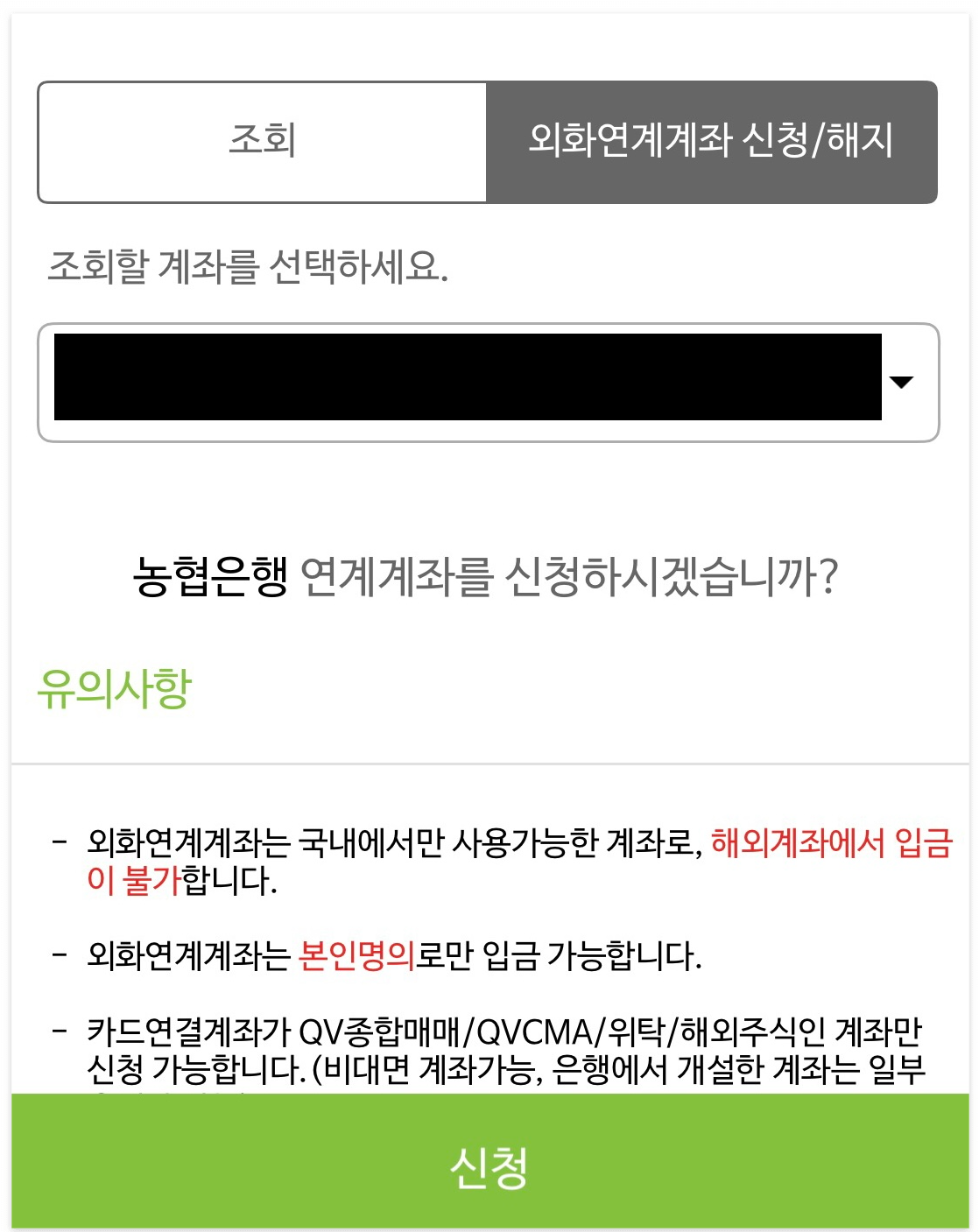 외화연계계좌 서비스 신청/해지를 선택한다.