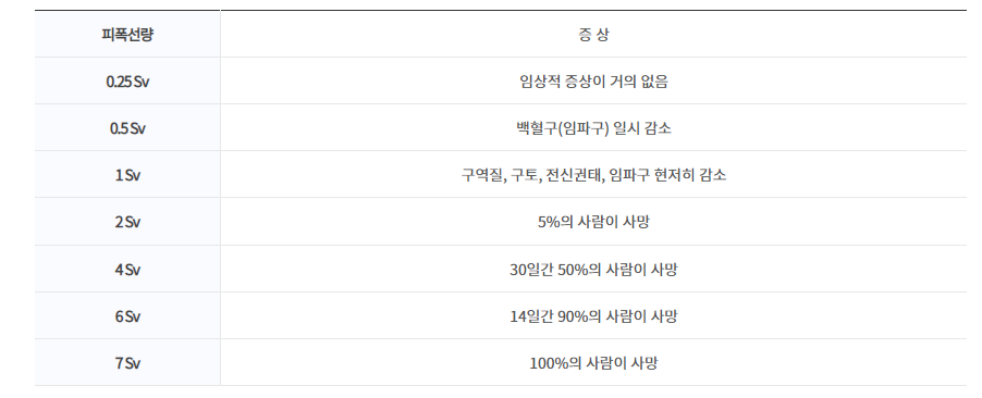 방사선 작업 종사자는 법적으로 1년간 최대 50 mSv, 5년간 총 100 mSv 피폭되는 것을 법으로 정해놓고 있다.