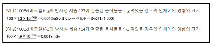 일본에서 제공하는 베크렐과 시버트 환산 공식을 이용하여 위험도를 확인해 보면 100Bq은 0.0013 mSv 또는 0.0019 mSv라는 값이 나오는 것을 확인할 수 있다.