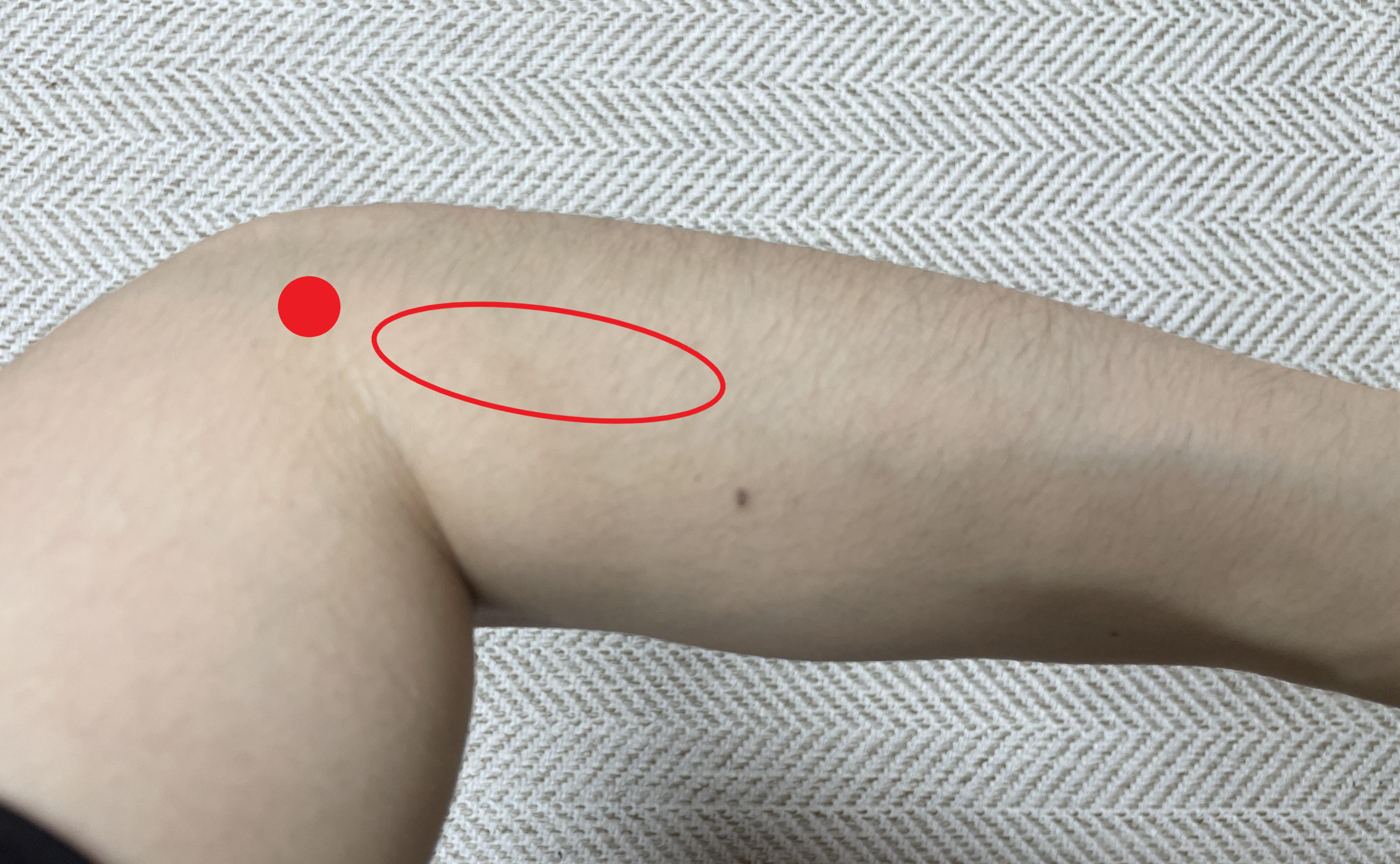 사실 난 체했을 때 곡지혈을 눌러본 적은 없다. 곡지혈 대신, 위 사진에서 타원 표시된 근육을 눌러주는데, 체기가 풀리는 것을 확실히 체감할 수 있었다. 몇 분간 지압해 주면 곧바로 트림, 가스가 나오고 속이 편안해지는 것을 느낄 수 있을 것이다. 해당 부위 또한 체했을 때 눌러주면 통증이 느껴지고, 통증이 사라질 때까지 눌러주면 체기가 풀리고 속이 편해지는 느낌을 받을 수 있다. 개인적으로 합곡혈 보다 더 효과가 좋았고 체했을 때 가장 쉽게 증상을 개선하는 지압 방법인 듯하다.