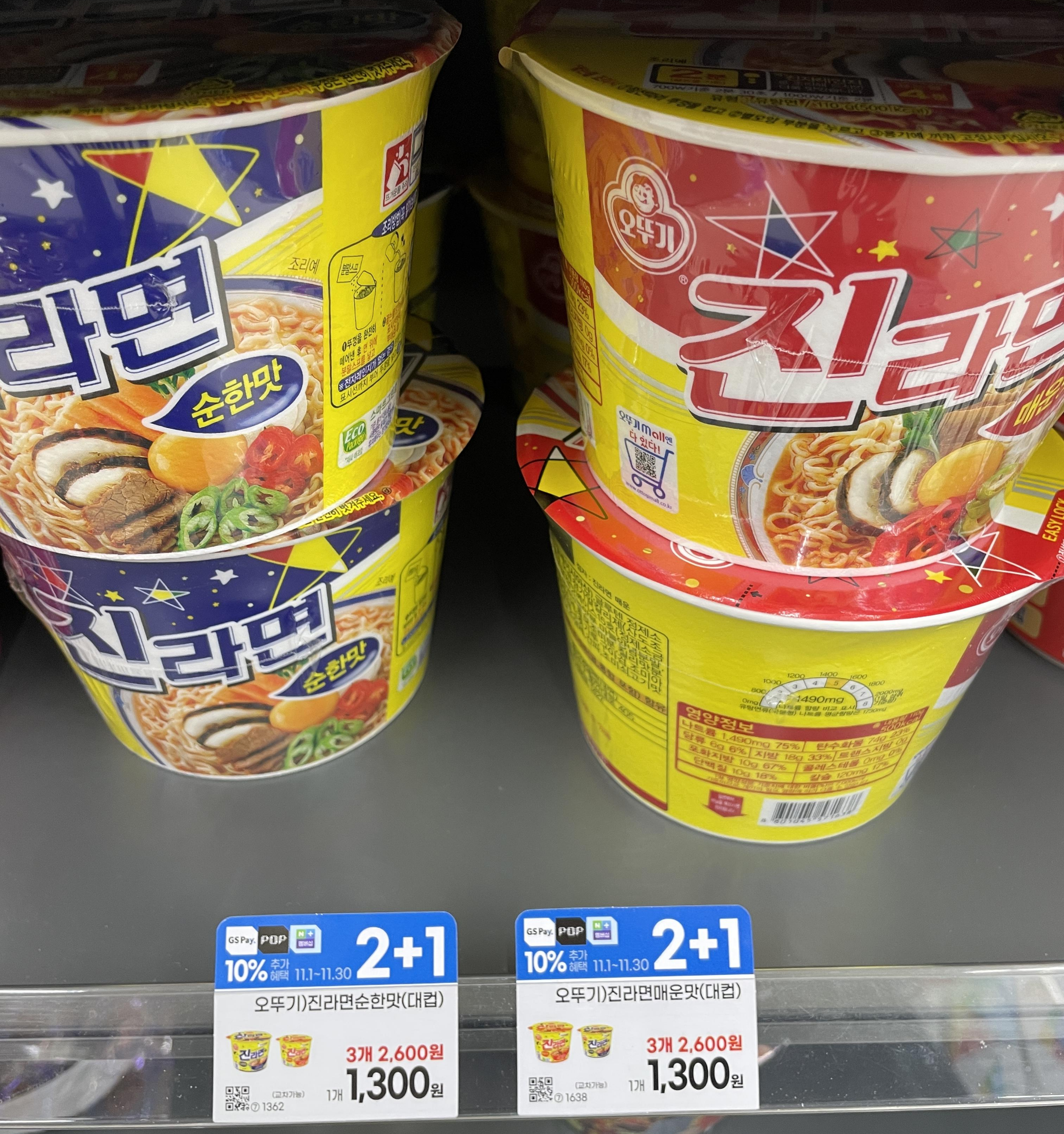 위 사진처럼 편의점에서 컵라면 행사 가격이 아니면 다이소에서 사는 것이 무조건 저렴하다. 편의점에서 2+1 이벤트를 해도 다이소 컵라면 보다 더 비쌀 때도 있다.