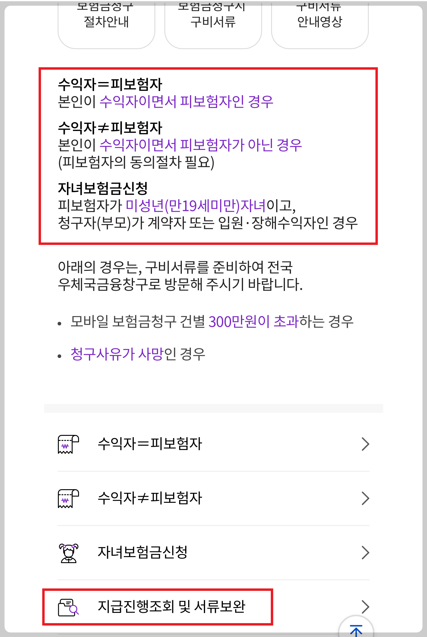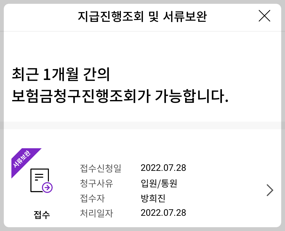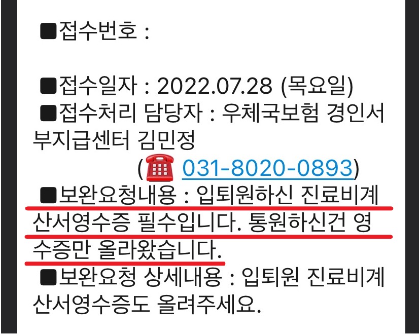 서류보완을 해주어야 합니다. 보험금 청구 신청 후